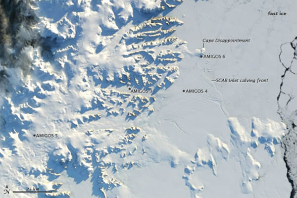 南极半岛2012年4月下旬出现的温暖天气是弗莱斯克冰川(Flask Glacier)上的AMIGOS 3站和失望岛(Cape Disappointment)上的AMIGOS 6站观测到的。上面第二幅照片由AMIGOS 6站于4月24日拍摄并于当天传送到卫星上。这幅照片展示了SCAR湾冰裂面的一部分,远处还可看到弗莱斯克冰川。