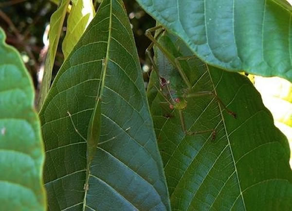 如果你不能立刻在这张照片中看到两只美洲大螽斯,不要感觉难过。它们像叶子一样的身体同样帮助它们逃避数不清的鸟类、青蛙、蛇和世界上其它的捕食者。美洲大螽斯是一种典型的看不到却能听到的物种,通过摩擦它们的翅膀来产生“katy-did”同名的声音。不管怎样美洲大螽斯不像它们的蟋蟀亲属,它们的雄性和雌性都能产生同样的声音。一些美洲大螽斯捕食更小的昆虫,但是它们最爱的食物是植物叶子,这从它们的外观上就看的出来。而且就像毛毛虫一样,美洲大螽斯对于叶子的喜爱通常会让它们同农民和园艺工人产生矛盾,只有几个捕食者群体正在努力看穿它们的伪装。