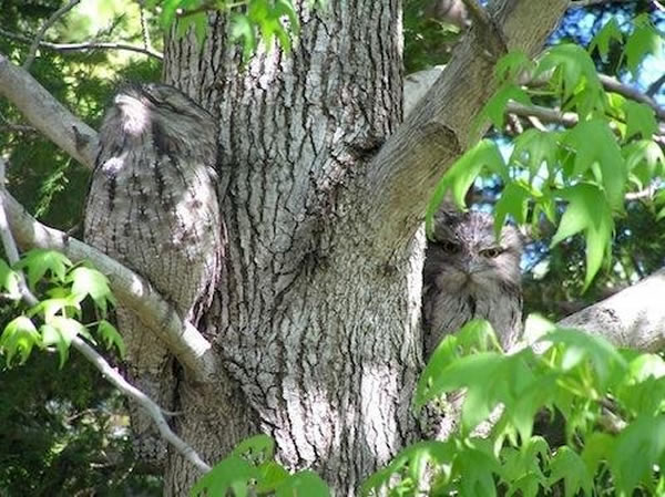 茶色蟆口鸱以其多孔的鸟嘴和黄色的大眼睛而闻名,它看起来像卡通片中的角色,当然是在它们没有模仿树木的时候。如果它们怀疑有危险,它们只须要闭上眼睛,把脑袋后靠并且融入到树皮当中,正如这张照片中左面的那只那样。尽管茶色蟆口鸱与猫头鹰有关,但是它们是非常不同的鸟类。它们是蹩脚的飞行者,举个例子说,它们不能使用它们的爪子捕捉猎物。事实上,它们甚至不会飞着去捕食,相反的是它们非常安静的呆在树上,等待它们的猎物靠近它们。夜晚它们就像猫头鹰,但是它们主要以昆虫为食,用青蛙一样的嘴巴捕食。