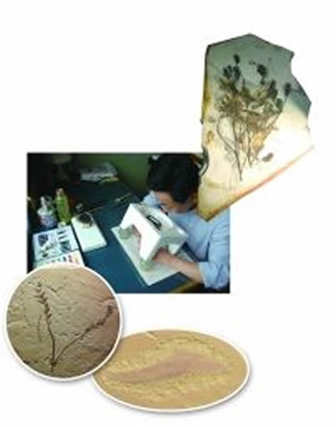 李歌军拿出了一块15cm×15cm大小的化石,上面有一株两个分叉的有点像草一样的植物。“这就是世界上第一朵花辽宁古果。别看不起眼,身价可不小。这朵花距今已经1.43亿年了,被认为是迄今唯一有确切证据的、全球最早的花,即是现在鲜花的‘祖先’。”“第一花”李歌军前后做了两次才满意,第一次专家用放大镜仔细看了10分钟,觉得纹理还不够细,李歌军换了更细的刻刀,又坐在桌前刻了两天,“眼都刻花了,连枝叶末端的毛毛我都刻了出来!专家才满意。”李歌军说,制出“第一花”让他在业界小有名气,随后仿制的距今5.3亿年前的世界上第一条鱼昆明鱼。