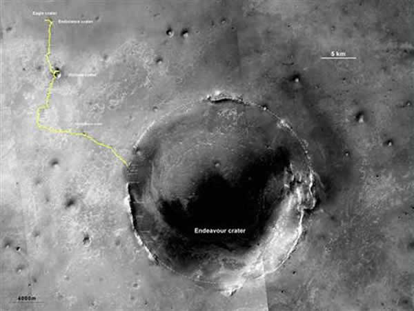 经过3年的旅程,机遇号火星车最终抵达奋进陨坑,这个陨坑是太阳早期陨星碰撞形成的