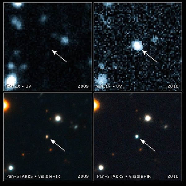 这组照片由宇航局的星系演化探测器和夏威夷的Pan-STARRS望远镜拍摄,展示了一个星系核出现的闪光。箭头所指的就是这个星系。闪光的出现说明星系中央的黑洞吞噬了一颗恒星
