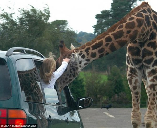 众所周知,长颈鹿经常在高树上寻找食物。然而,在英国伍斯特郡的一个野生动物园内,一只长颈鹿却把头低下,伸进一辆驶过小轿车的车窗里,向游客“主动讨食”。