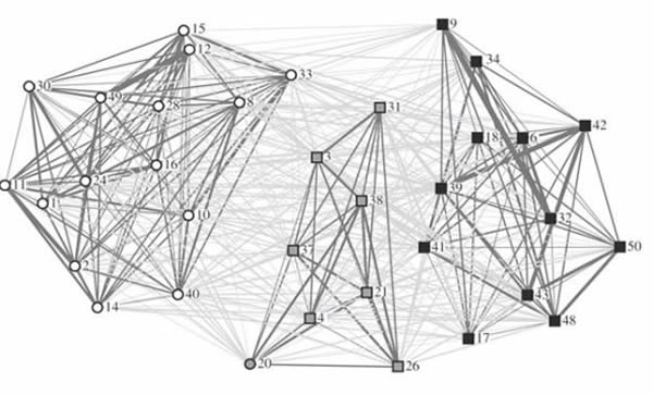 在这幅图解中,白点代表海豚,灰色方块代表鲻鱼,黑点方块代表等待鲻鱼上门的渔船