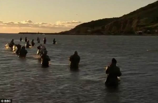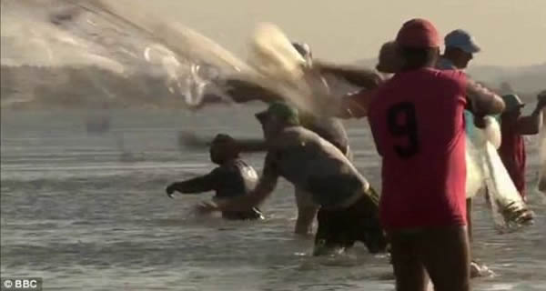 渔民站成一条线,等待海豚将鲻鱼赶过来