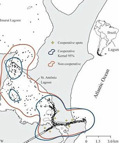 在巴西拉古纳,当地的宽吻海豚与渔民形成一种令人吃惊的合作关系——帮助渔民捕鱼。它们会将鲻鱼群赶向渔民,而后摇晃脑袋和拍打尾巴,在海面上溅起水花,通知渔民抛出渔网。