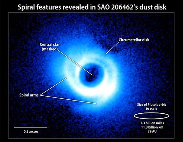 研究人员将这颗年轻的恒星编号为SAO 206462,在强大的引力作用下,原始气体盘已经分裂具有两个螺旋臂的盘状结构。正是螺旋臂的发现,使得天文学家们进一步调查其是否有年轻的行星正被气体盘中的物质塑造出来。