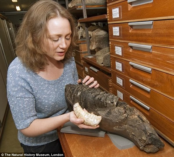 伦敦国家历史博物馆维多利亚-赫瑞奇(Victoria Herridge)博士正在分析一个猛犸牙齿和部分猛犸鼻部化石样本