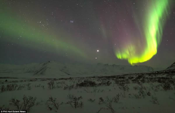 苏格兰阿伯丁的菲尔-哈特为捕捉这一天文现象的精彩画面,拍了7500多张照片。比所有星球都亮的金星和木星在夜空擦身而过时,这位35岁摄影师冒着近北极的恶劣气候条件进行拍摄。有张照片展示了北极光和附近月亮形成的跳舞图案,这成为此次拍摄的一大亮点。