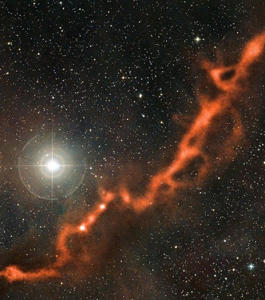 科学家使用位于智利阿塔卡马沙漠的探险者试验(APEX)望远镜发现肉眼或者可见光波段无法察觉的黑暗宇宙尘埃。在这条长达十光年的宇宙尘埃云背后,隐藏着年轻的恒星以及正在诞生的恒星。虽然这片尘埃云吸收了部分波段的光线,但其发射的特定波长辐射可被阿塔卡玛探险者试验望远镜察觉。科学家分别绘制了在可见光与亚毫米波段下的宇宙尘埃图像。