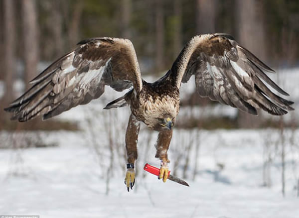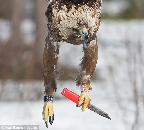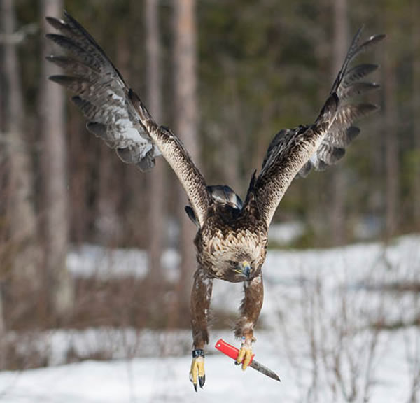 荷兰摄影师汉-鲍维梅斯特在瑞典Vasterbotten地区使用这把匕首来切割肉,用于吸引空中猛禽。然而,他在忙碌之际不小心将一把匕首掉在地上,他说:“当这只金雕飞入相机的视野范围,我突然看到它的爪子上攥着那把红柄匕首,我确信这是由于我的粗心才将匕首掉落在雪中。”