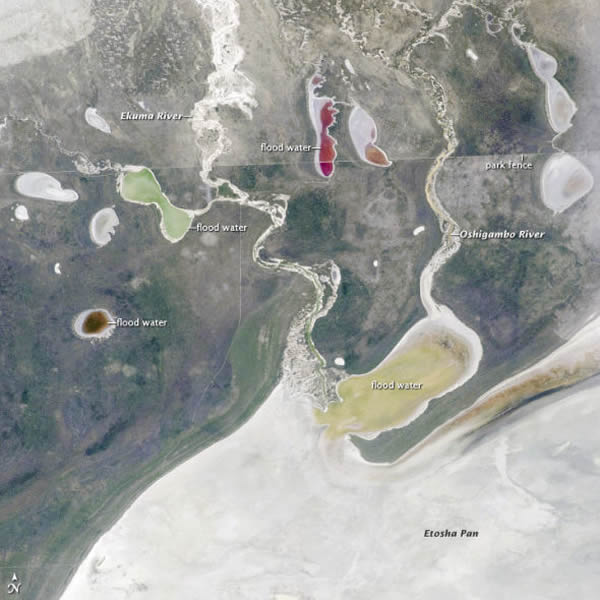 通常情况下,河水不能到达埃托沙盐湖,因为河水会渗入流经的河床。埃托沙盐湖湖床自身也很少积水。在这幅照片中,我们可以看到,由于降雨量较大,河水最终到达了埃托沙盐湖,但大部分的河水仅仅到达盐湖的湖湾就停止了。2006年,这个地区也曾发生过一次洪水,洪水通过Oshigambo河流入了埃托沙盐湖主湖区。