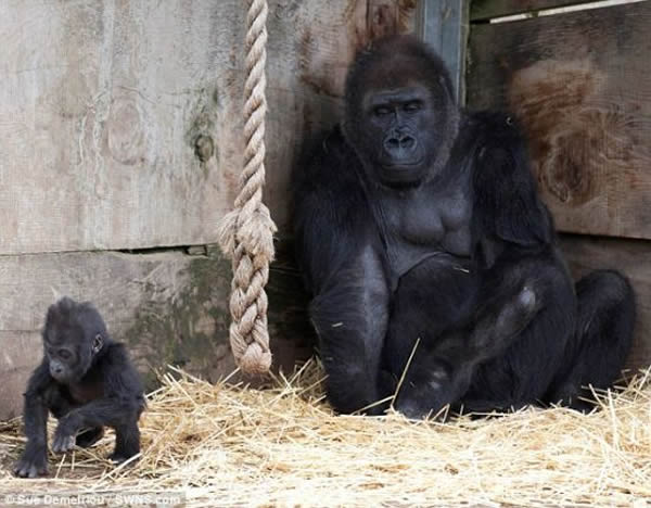 库克那探索布里斯托尔动物园时,大猩猩妈妈沙洛姆用警惕的目光注视着它。