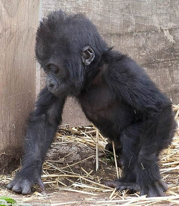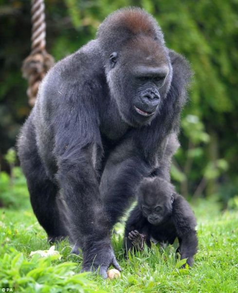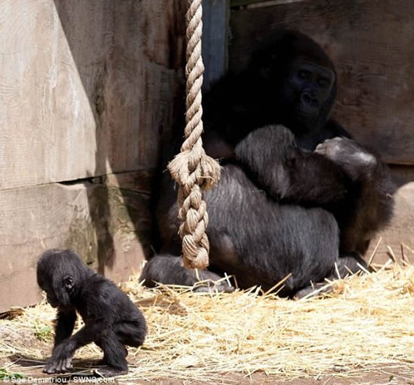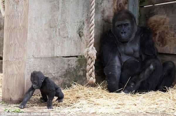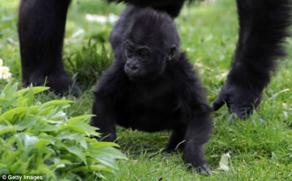 虽然走起来十分不稳,这头西部低地大猩猩幼崽依然努力抬起后腿,用四肢行走。妈妈沙洛姆一直用警惕目光注视着这个可爱的小家伙。