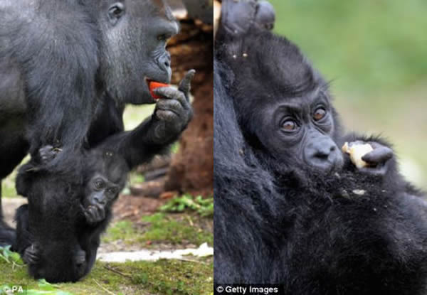 探索未知世界使这对母子感到饥饿,于是大吃起来。库克那是沙洛姆在布里斯托尔动物园产下的第三个孩子