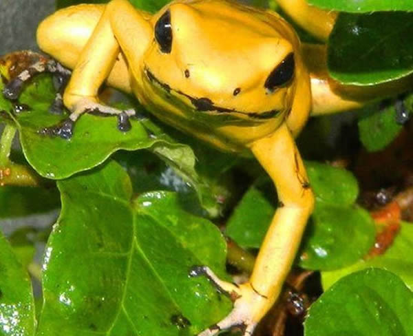 这种蛙类拥有亮黄色的皮肤,并且上面有一层致命的生物碱毒液覆盖。这种毒液会阻断神经冲动的传递,让肌肉收缩抽搐并最终导致心脏衰竭,在数分钟内便可以致人死亡。