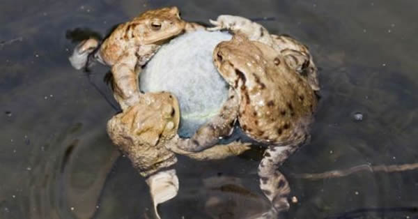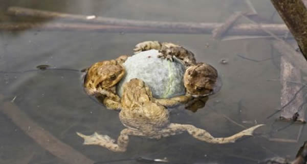 这些雄蟾蜍紧紧抱在一个已经褪色的网球上,将它误认为一个异性伴侣。