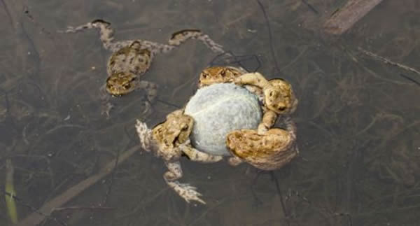 迪尔斯切尔在德国慕尼黑附近施托克多尔夫的一个小湖中拍到几只蟾蜍对一个网球坠入爱河。照片十分清晰,竟连它们身上的疙瘩都能看见。
