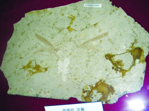 一进入展厅,南京地质古生物所张海春教授就向记者推荐了一块奇特的化石:上面清晰地保留了两只昆虫。“这是沙螽,化石上面的是一雌一雄两只。”张海春告诉记者,这块化石被发现在内蒙古宁城地区,属于著名的道虎沟昆虫群。地质年龄大约是1.65亿岁,该生物群也是世界上中生代昆虫类别最繁多的动物群。