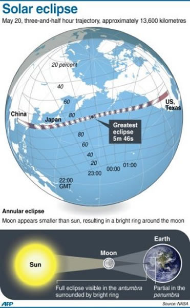 5月20日至21日,中国、日本及美国一些地区将陆续出现日食景观。美国专家表示,这是美国大陆18年来首次观察到这种日食,但它仅经过美国西部。在中国,此次日环食将是太阳“带食而出”。