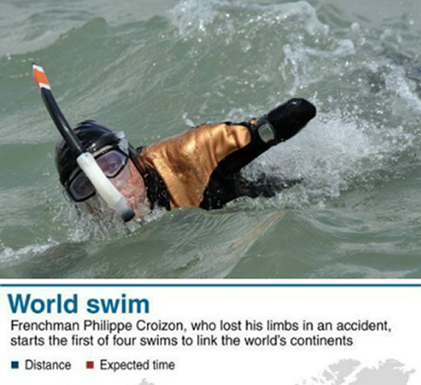 法国一四肢全无男子开始游泳横跨五大洲之旅