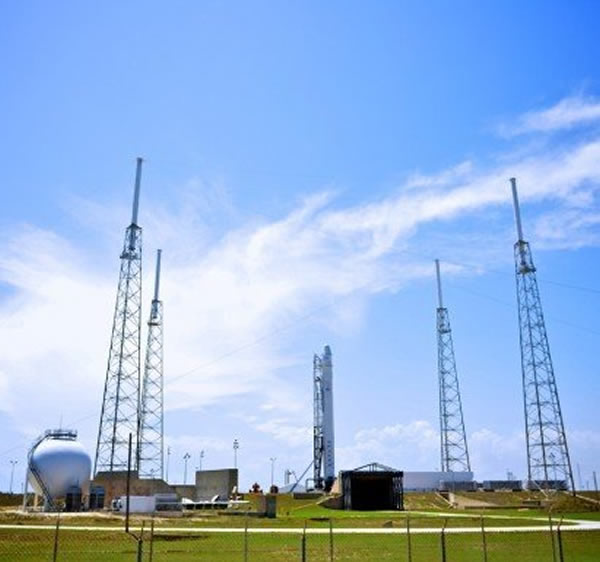 矗立发射工位的“猎鹰”9号火箭与顶部的“龙”式宇宙飞船