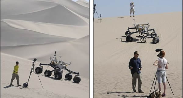 一名摄像师正在拍摄Scarecrow。Scarecrow是“好奇”号的工程原型,体积一模一样,长10英尺(约合3米),重量是此前火星车的5倍
