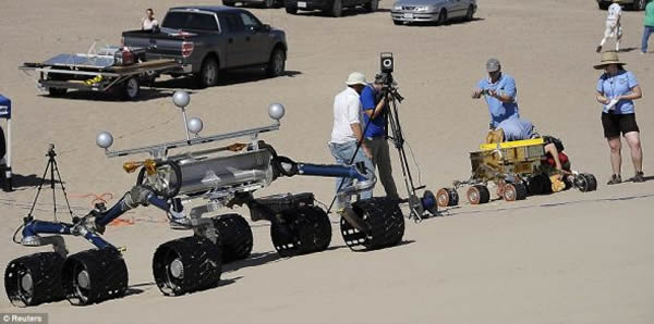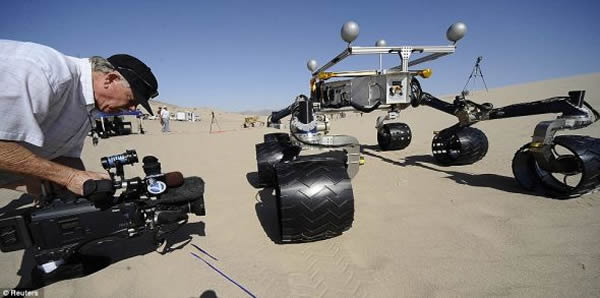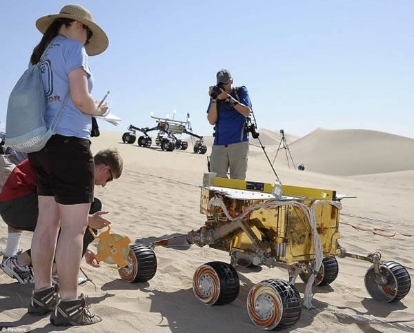 在加利福尼亚州贝克附近的沙漠,美国宇航局的科学家正在测试新一代火星车“好奇”号的工程原型Scarecrow。“好奇”号火星车于2011年11月26日发射升空,3个月内,这辆火星车将在火星赤道一带盖尔陨坑内一座山的底部着陆。8月5日,所有控制人员必须做好准备,让耗资16亿英镑(约合25亿美元)的“好奇”号顺利在火星着陆。