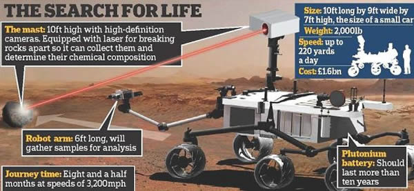登陆之后,“好奇”号将以每小时大约300英尺(约合91米)的速度在盖尔陨坑内跋涉,执行考察任务。“好奇”这个名字是一名6年级女学生起的,在为这辆火星车征集姓名的比赛中,这位女生所起的名字最后脱颖而出。2011年,“好奇”号搭乘阿特拉斯5型火箭在卡纳维拉尔角发射升空。