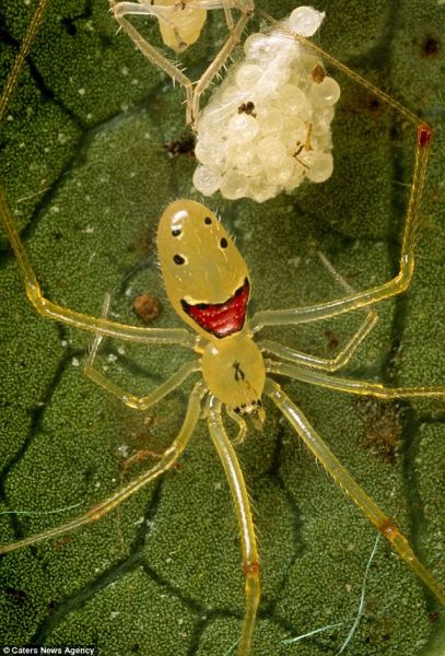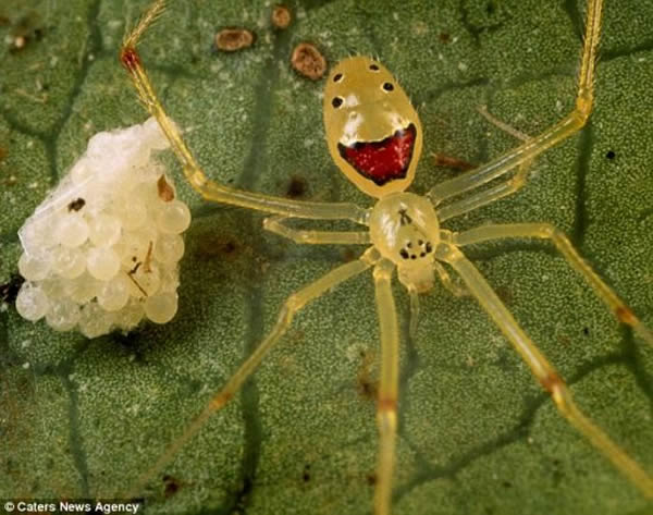 在夏威夷群岛的雨林,美国马萨诸塞州的女摄影师达利娜-穆拉维斯基拍到怪异的蜘蛛,身上的斑点形成一张笑脸,被形象地称之为“笑脸蛛”。笑脸蛛的身长只有几毫米,据信对人类无害。