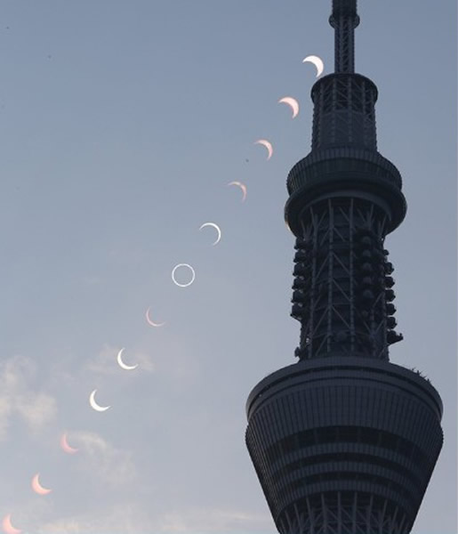 当地时间5月21日上午7点37分,东京千代田区的JR御茶水车站附近拍摄到的“金环日食”。(摄影:增田教三;来源:日本读卖新闻网)