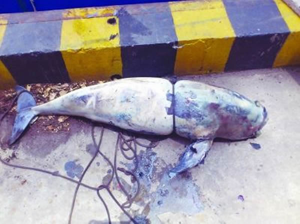 太仓市民马先生向扬子晚报反映,昨天中午,太仓港码头上的工作人员突然发现港口有一头疑似江豚。为防止江豚被江水冲走,工作人员迅速用绳索将江豚固定。渔政部门工作人员接到报告后,立即赶往现场,组织人员将江豚打捞上岸。渔政部门工作人员到达后经辨认确认为江豚无疑,然而这头雌性江豚早已死亡,死亡时间大概在一个星期左右。据渔政部门工作人员现场测量,此江豚长约140厘米左右,胸围约40厘米左右,体重大约在25公斤,头部钝圆、额前突;皮肤依旧有光泽,按上去仍很有弹性;身体局部已经稍有腐烂。记者看到,这头江豚全身褐色表皮大部分已经脱落,泛白的躯体上遍布着斑斑血迹,由于已经开始腐烂,散发着阵阵恶臭。渔政部门工作人员对这条江豚进行解剖发现,江豚胃部没有发现食物的存在,估计是被饿死的。据渔政部门工作人员介绍,此次发现的这头已死亡江豚应该算是青壮年,蛮难得的,从外部看并无明显伤痕,极有可能是长江江豚的食物链遭到了破坏,从而被活活饿死。