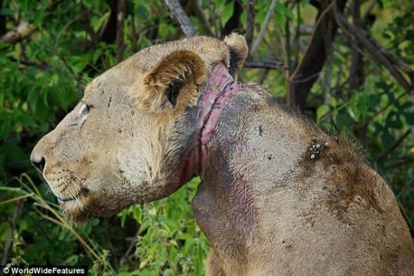 人们在坦桑尼亚北部的米库米国家公园内发现这头年轻的雄性狮子,它的脖子上被一个盗猎者设下的铁丝圈套紧紧地套住