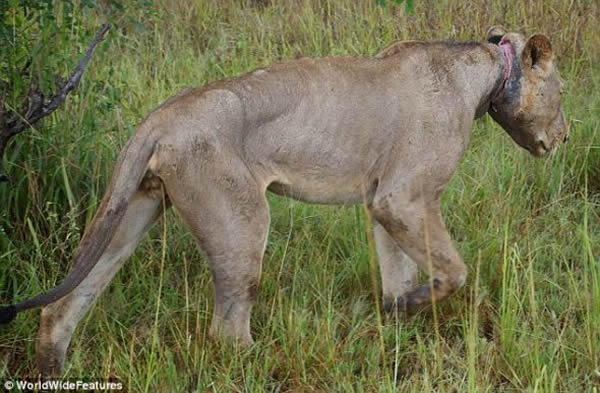 由于铁丝缠绕太紧,这头狮子已经无法进食,它将注定死于感染或者饥饿