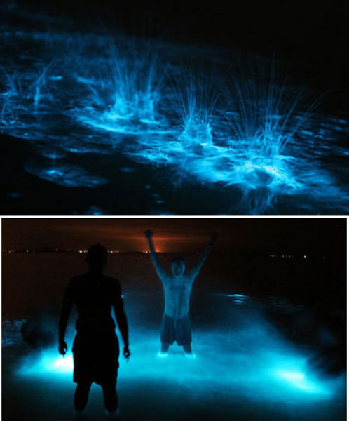 摄影师菲尔-哈特(Phil Hart)拍摄到这一美丽的蓝色发光现象,甚至观察到夜光藻强烈的自然防御机制。当它们感觉到有掠食者在附近时,夜光藻就会发光,吸引更大的掠食者首先吞食附近的掠食者。因此,当人们在水中嬉戏玩耍时就会在湖泊中发出蓝色荧光。