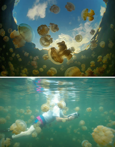 在充满水母的湖泊中游泳不见得是一件好事,人们可以想像在这个湖中将遭受无数水母的蜇痛。这个湖泊中聚集着数百万计的海洋生物,人们可以和数百只水母相伴潜水、漂浮在水面。据悉,湖泊中的黄金水母的蜇痛过于轻微,几乎没有疼痛感觉。这里是帕劳群岛南部泻湖中最荒凉、居住人口最少的岛屿。
