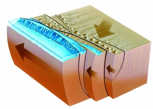 地下岩石断裂的地方被称为断层。随着板块继续运动,它们会折断越来越多的岩石,沿着断层引发更多地震。圣安德烈斯断层是美国境内最有名的断层,它位于太平洋板块和北美洲板块的交界处,在加利福尼亚州境内绵延约1300千米。圣安德烈斯断层一带发生过很多次地震,其中包括1906年的旧金山大地震。地震并不是板块交界处发生的唯一的自然现象。在运动板块交界处的地下深处,会有岩石熔化。这些熔岩有可能上升,并喷出地面,形成火山。