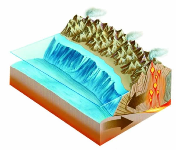 当较薄、密度较大的海洋板块滑到较厚、密度较小的大陆板块下方时,强烈的地震或火山爆发就会发生。