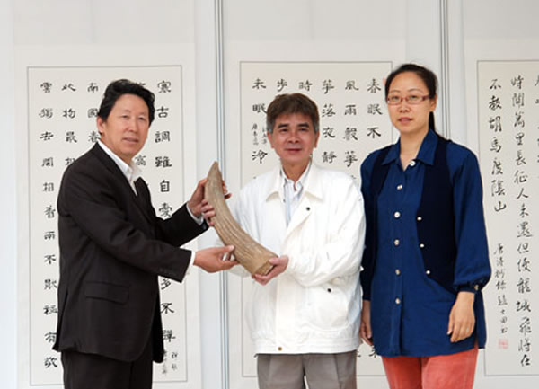 台湾乾隆艺术馆黄敬生向石河子大学博物馆捐赠冰河时代犀牛角化石 来源: 神秘的地球 时间:2012年5月24日 10:25 台湾乾隆艺术馆黄敬生(中间者)向石河子大学博物馆捐赠冰河时代犀牛角化石 5月23日获悉,台湾乾隆艺术馆黄敬生先生向石河子大学博物馆捐赠了一枚冰河时代犀牛角化石。化石长40多厘米,形态完整,质地细腻,极具学术研究价值。 黄敬生先生为台湾乾隆艺术馆馆长,十多年来为沟通海峡两岸文化交流做了大量工作。此犀牛角化石为黄先生个人藏品,因与石大博物馆馆长刘玉社文化结缘多年而赠予。为表答谢,刘玉社将自己所创作的水墨人物画《葡萄熟了》赠予了黄先生。 中国日报(记者 毛卫华 通讯员 薄晓岭 张素虹) 上一篇 下一篇 TAG: 化石 犀牛