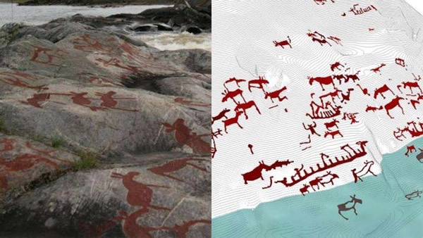 这些岩石壁画位于俄罗斯的Zalavruga和瑞典的Nämforsen地区,英国剑桥大学(University of Cambridge)的Mark Sapwell通过最新的影像技术,在足球场大小的巨型花岗岩上收集分析了数以千计的岩石壁画图像。Sapwell解释道:“岩石壁画位于河网密集地区,小船是当时的重要交通工具,岩石壁画常常位于急流和瀑布附近,是古人类离开河流及沿途经过的地方,壁画既是地点标记,同时也是一个艺术绘画站。”