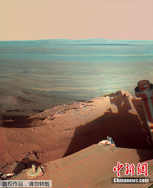 “机遇号”探测器在火星拍到自己的阴影 来源: 神秘的地球 时间:2012年5月25日 13:31 “机遇号”探测器在火星拍到自己的阴影 5月22日,美国宇航局的火星“机遇号”探测器在傍晚时分拍到自己的阴影。它是在火星时间下午4点到5点之间拍的。大多数组件图像记录在第2888个火星日被记录,即2012年3月9日。那时,“机遇号”正经历火星冬天的低太阳能周。这张拼图融合了数张全景过滤器的图片及753毫微米的波长,535毫微米绿色波长及432毫微米的紫色波长。图片与实景有些不同,以便实物更容易辨认。 中国新闻网 上一篇 下一篇 TAG: 火星 机遇号 探测器