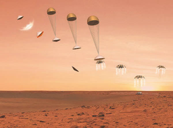 在所有成功接触到了火星大气的11次火星任务中,有5次由于在进入大气层、下降和着陆(EDL)阶段出现故障而失败,这也是为什么工程师们将这个阶段称为“恐怖的7分钟”的原因。对于火星科学实验室任务来说,研究人员重新设计了进入EDL阶段的过程。他们用精确的引导进入系统取代了以往粗糙的进入方式,并开发出了新的着陆方法—太空起重机,这种方法今后将成为大型太空车的标准着陆方法。