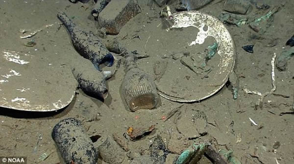 数千名观众:科学家用一部水下机器人发现这艘19世纪的遇难船,他们向陆上的数千名观众直播了整个过程。这张照片展示了残骸上的部分陶瓷盘和玻璃瓶。