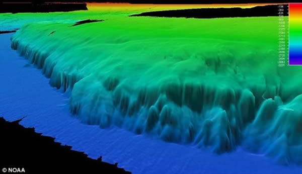绘制成图:美国国家海洋与大气管理局的声纳捕捉到西佛罗里达悬崖的图像。它的底部显示蓝色,有2600米深。它的上缘超过600米。
