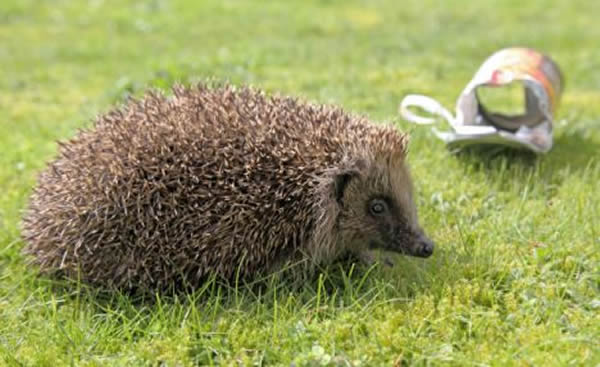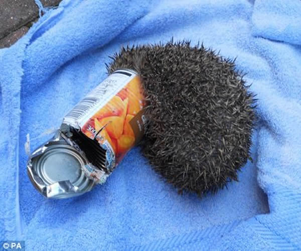 一只刺猬不慎把头伸进易拉罐里,结果卡在罐内出不来,奄奄一息。一对路过的好心夫妇将此事通知英国动物保护的相关部门,小刺猬才最终得救。