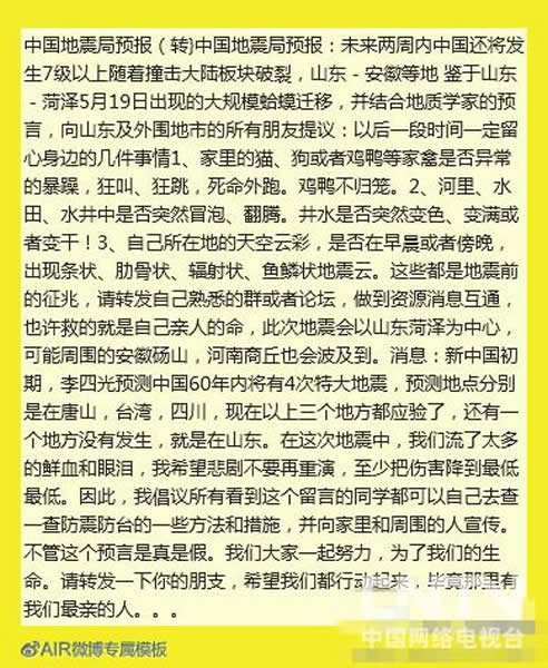 微博称:“中国地震局预报:未来两周内中国还将发生7级以上地震。随着撞击大陆板块破裂,波及山东-安徽等地。” 网友还基于山东-菏泽5月19日出现的大规模蛤蟆迁移,并结合地质学家的预言,向山东及外围地市的所有朋友提议:以后一段时间一定留心身边的几件事情:1、家里的猫、狗或者鸡鸭等家禽是否异常的暴躁,狂叫、狂跳,死命外跑。鸡鸭不归笼。2、河里、水田、水井中是否突然冒泡、翻腾。井水是否突然变色、变满或者变干!3、自己所在地的天空云彩,是否在早晨或者傍晚,出现条状、肋骨状、辐射状、鱼鳞状地震云。……此次地震会以山东菏泽为中心,可能周围的安徽砀山,河南商丘也会波及到。