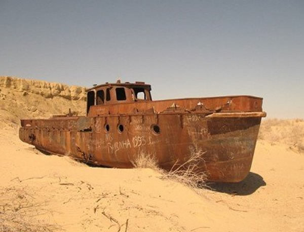 在乌兹别克斯坦在沙漠中可能遇到一番奇怪的景象,数艘幽灵般的铁壳船躺在沙漠中晒太阳。这些船来自过去某个年代,当时的这片土地还是被海水所包围,是一个盛产鱼类以及能为周边居民提供交易的场所。但是在一些年后,该地区的很多海水够干涸了,大多数的鱼也死了,只剩下生锈的船体。海水完全干涸后,这里的渔民也逐渐迁走,而他们的船便成这里的唯一物件。这片海域原先被称为咸海,是一个内陆咸水湖。