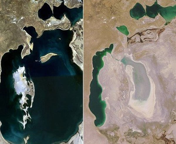 在上个世纪60年代左右还是世界上最大的湖泊之一,覆盖面积为2.63万平方英里,但是现在剩下大约2000平方英里的水域,分成四个较小的湖泊而存在。在上个世纪初,前苏联政府想要将咸海中的水资源引入沙漠进行灌溉,以发展棉花和其他作物,导致了咸海水域的水位逐渐下降。大规模的灌溉活动开始于上个世纪的40年代,前苏联修建了大型而效果不佳的运河渠,计划将河流中的水引出,而这些河流中的水资源最后将汇入咸海中。随着上游河流中的水资源被抽干,流入咸海中的水流量下降,使得咸海的盐度增加,结果其中生活的鱼群都死亡了,周围的渔业生产也随即覆灭。