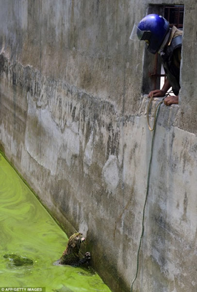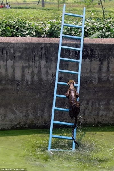 印度一只花豹跌入池塘 来源: 神秘的地球 时间:2012年5月31日 16:27 印度一只花豹跌入池塘 花豹借梯子登上岸 印度一只花豹跌入池塘,周围是4米高的墙,它在水中奋力挣扎一小时仍无法上岸。救援人员伸下长梯,最终花豹借助梯子爬上岸消失在丛林里。 据报道,这只野生花豹被人发现跌入印度东北部城市Sangatram的水塘中。救援人员最先扔下一张网试图将其捞起,但花豹拒绝这种方式,似乎以为人们会逮住它。后来,野生动物小分队的工作人员将一梯子置入水中,花豹便沿着梯子爬上岸。 据悉,池塘的所在地是一茶园,目前尚不清楚花豹是如何跌入池塘中的。 中新网5月30日电 上一篇 下一篇 TAG: 花豹