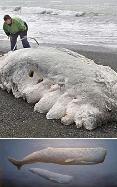 目击者罗丝-弗瑞泽(Rose Fraser)在蒂姆卡海滩上散步时意外地发现一种神秘生物尸体躺在海滩,他说:“我必须承认,我起初认为这是一种外星生物!它看上去像是长有很大的肋骨,但又看上去像是长有触须。因此我并不能确定它是何种生物。”之后科学分析很快破解了其中的谜团,事实上并不是罗丝所认为的外星生物登陆地球海滩,这些神秘的团状生物尸体仅是一条抹香鲸的头部。新西兰新闻媒体推断称,我们并不知道这条抹香鲸是如何死亡的,坦白地讲我们也不想知道。